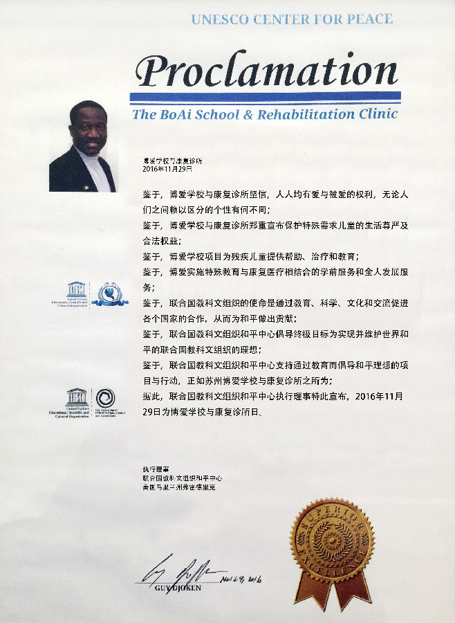 除此以外,Guy还为博爱学校带来了联合国教科文组织和平中心的宣言,该份宣言充分肯定了博爱学校的办校理念。因宣言在11月29日颁发,以后每年的这天都将是博爱学校诊所日。