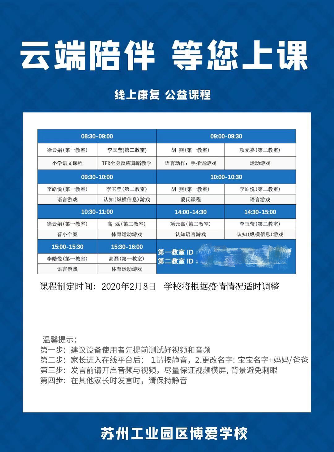 苏州工业园区博爱学校在疫情防控期间,认真积极落实省、市教育部门2020年春季学期开学时间延期及疫情防控要求外,及时成立了家庭 “互联网+教育+康复” 服务指导小组,最大限度促进特需儿童居家活动与参与能力,缓解家长的心理压力和焦虑情绪,也有利支持了抗击疫情。